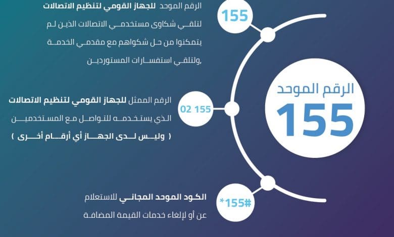 ومن الجدير بالذكر أن الرقم الموحد للجهاز القومي لتنظيم الاتصالات لتلقي شكاوى مستخدمي الاتصالات الذين لم يتمكنوا من حل شكواهم مع مقدمي الخدمة هو 155، والرقم الممثل للجهاز الذي يستخدمه للتواصل مع المستخدمين لمتابعة شكواهم هو 155 (02)، لذا يهيب الجهاز بالسادة المستخدمين عدم الإفصاح عن بيناتهم الشخصية لأي شخص أو جهة دون التأكد من هويتها، وأن أي جهة تقوم بالتواصل معهم من خلال أرقام أخرى فهي غير ممثلة للجهاز القومي لتنظيم الاتصالات.