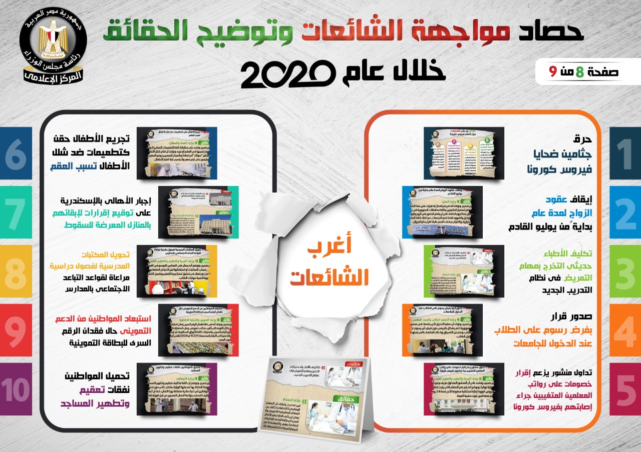 وفي هذا الصدد نشر المركز الإعلامي لمجلس الوزراء، تقريراً تضمن إنفوجرافات سلطت الضوء على حصاد مواجهة الشائعات وتوضيح الحقائق على مدار عام 2020.