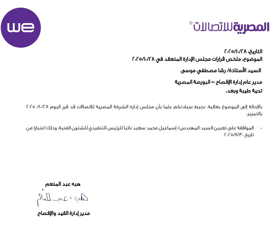 تأكيدًا لما نشرته منصة ICT Business في الثالث من أكتوبر الحالي، أعلنت الشركة المصرية للاتصالات رسميًا عن صدور قرار من مجلس إدارتها في جلسته المنعقدة بتاريخ 28 أكتوبر 2025، بالموافقة على تعيين المهندس إسماعيل محمد سعيد نائبًا للرئيس التنفيذي للشؤون الفنية، وذلك اعتبارًا من 30 نوفمبر 2025.