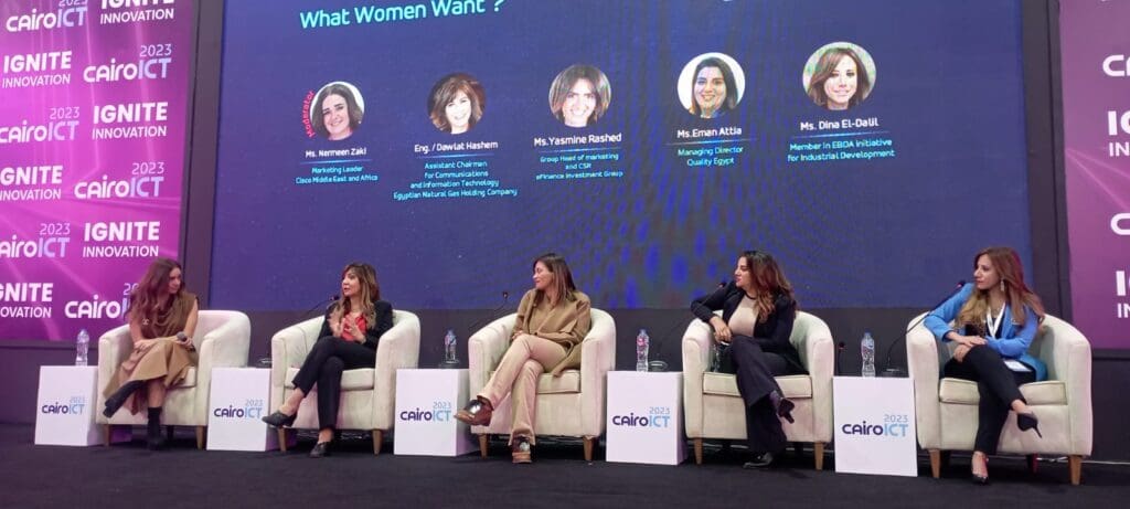 ناقشت جلسة “ماذا تريد السيدات” في قطاعات الأعمال المختلفة ضمن إحدى جلسات معرض (Cairo ICT) والتي أدارت الحوار فيها نرمين زكي، مديرة التسويق بشركة سيسكو في الشرق الأوسط وأفريقيا.