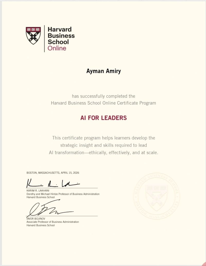 “أيمن أميري” يحصل على شهادة “AI for Leaders” من هارفارد لتعزيز قيادة التحول الرقمي
