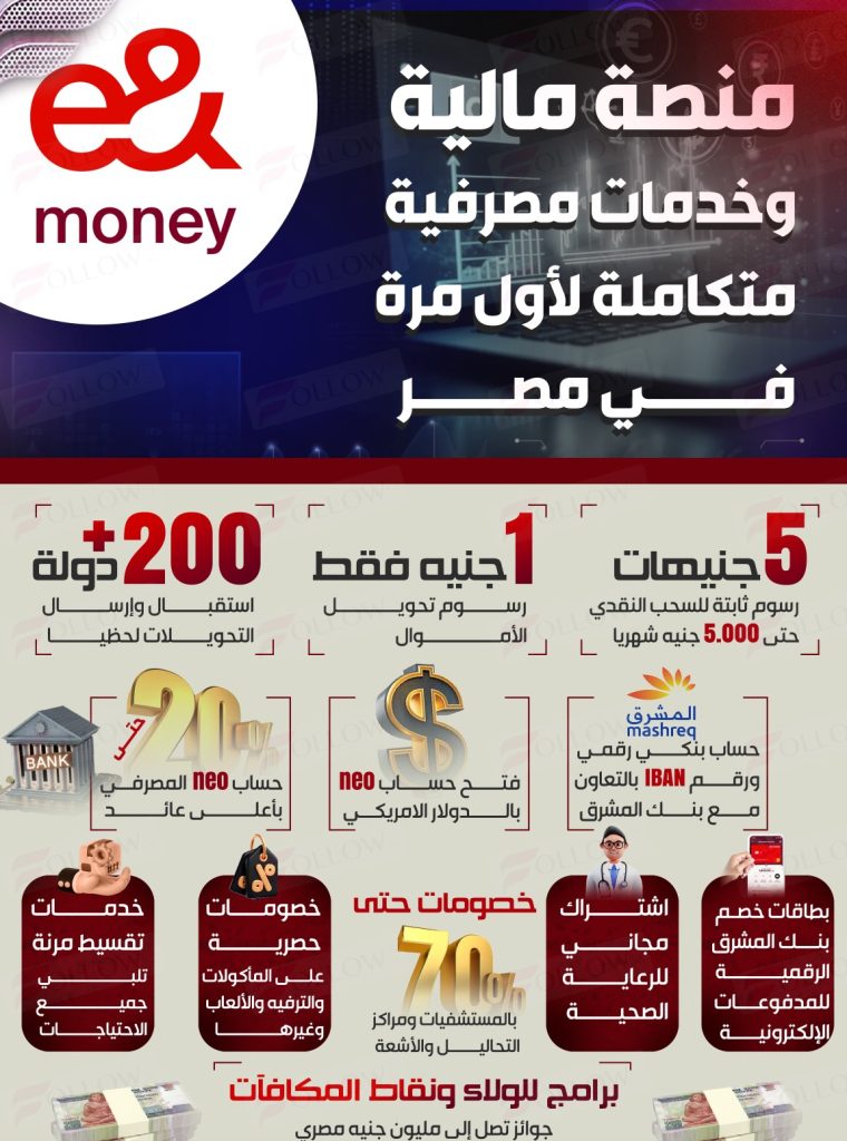 وترتقي “e& money” بخدمات المحافظ الرقمية إلى منظومة مالية متكاملة تجمع بين الخدمات المصرفية والرقمية بالتعاون مع بنك المشرق (Banking as a Service)، والتي تشمل فتح حساب مصرفي (إي اند مشرق نيو) بفائدة علي حسابات التوفير تصل إلى 20%، هي الأعلى في السوق المصري، والذي يُمكن العميل من الحصول على بطاقة ائتمان بمميزات تنافسية، وإمكانية فتح حساب بالدولار الأمريكي بسهولة، لإجراء و استقبال أي تحويلات دولية بكل سهولة ، هذا بالإضافة بإتاحة الفرصة لعملاء إي اند مشرق نيو بإجراء و استقبال التحويلات بالجنيه المصري لحظيًا.
