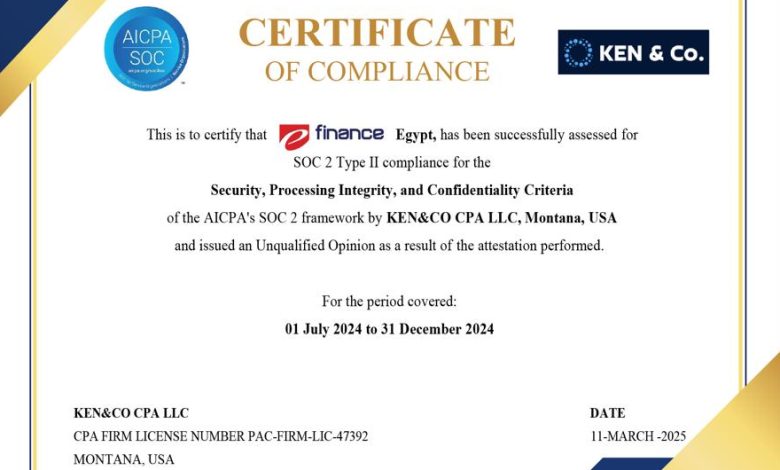 أعلنت شركة تشغيل المنشآت المالية “إي فاينانس” التابعة لمجموعة “إي فاينانس” للاستثمارات المالية والرقمية، عن نجاحها في اجتياز تدقيق SOC2 Type2 فيما يخص خدمات الدفع و التحصيل الالكترونى، حيث تعد هذه المرة الأولى التي تحصل فيها الشركة على تقرير Type2.