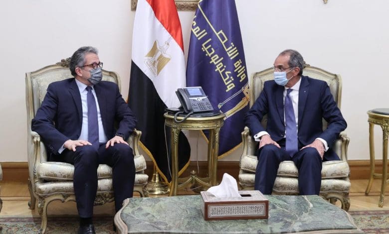 فى إطار التنسيق الدائم بين وزارتى السياحة والآثار والاتصالات وتكنولوجيا المعلومات والاجتماعات الدورية لمتابعة الموقف التنفيذى لمشروعات التحول الرقمى وتطوير البنية التكنولوجية السياحية فى ضوء بروتوكول التعاون الموقع بين الوزارتين فى نوفمبر 2020، عقد الدكتور خالد العنانى وزير السياحة والآثار والدكتور عمرو طلعت وزير الاتصالات وتكنولوجيا المعلومات اجتماعا موسعا مع رئيس الاتحاد المصرى للغرف السياحية وبعض قيادات الوزارتين للوقوف على أخر مستجدات الأعمال فى مشروع رفع كفاءة سرعة الإنترنت بالمنشآت الفندقية على مستوى الجمهورية ولاسيما تلك الموجودة بمدينة شرم الشيخ، كمرحلة أولى، استعدادا للتجهيزات السياحية لاستضافة مؤتمر الأطراف السابع و العشرين لاتفاقية الأمم المتحدة لتغيير المناخ « COP27 ».