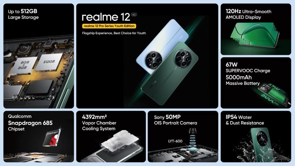 يأتي هاتف realme 12 4G بكاميرا SONY LYT-600 بدقة 50 ميجا بكسل، وشاشة AMOLED بتردد 120 هرتز مع سطوع فائق يصل إلى 2000 نت، بالإضافة إلى تقنية اللمس الذكية التي تتيح استخدام الهاتف حتى أثناء تعرضه للماء. ويدعم الهاتف شاحن SUPER VOOC بقوة 67 واط، مما يمكنه من شحن البطارية حتى 50% في 19 دقيقة و100% في 47 دقيقة فقط.