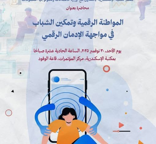 تنظم مكتبة الإسكندرية بالتعاون مع وزارة الاتصالات وتكنولوجيا المعلومات محاضرة بعنوان «المواطنة الرقمية وتمكين الشباب في مواجهة الإدمان الرقمي»، وذلك يوم الأحد الموافق 30 نوفمبر 2025 في قاعة الوفود بمركز المؤتمرات بمكتبة الإسكندرية، في تمام الساعة 11.00 صباحًا.