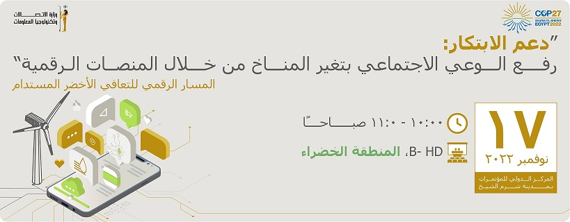 أعلنت وزارة الاتصالات وتكنولوجيا المعلومات عن انعقاد جلسة نقاشية بعنوان “دعم الابتكار: رفع الوعي الاجتماعي بتغير المناخ من خلال المنصات الرقمية” وذلك في إطار فعاليات “يوم الحلول” المنعقد خلال مؤتمر الأمم المتحدة المعني بتغيّر المناخ COP27 بشرم الشيخ. وموضوع الجلسة هو “المسار الرقمي للتعافي الأخضر المستدام”.