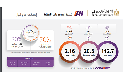 كشف البنك المركزي المصري عن إجراء 20.3 مليون معاملة بقيمة 112.7 مليار جنيه لـ 2.16 مليون عميل عبر شبكة المدفوعات اللحظية “إنستا باي” خلال العام الأول لإطلاقه والتي يستمر العمل بها بدون رسوم حتى نهاية العام الحالي.