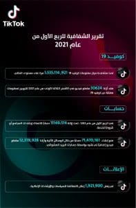 وفيما يتعلق بجهودها للتوعية بفيروس كوفيد-19، تواصل” تيك توك” العمل مع خبراء الصحة العامة لمساعدة مجتمعهم على البقاء آمنًا، وتوفير أحدث المستجدات بخصوص فيروس كوفيد-19 واللقاحات، وفي الربع الأول من عام 2021، حقق مركز معلومات كوفيد-19 نسب مشاهدات غير مسبوقة تخطت المليار ونصف مليار مشاهدة على مستوى العالم، فيما تمت مشاهدة إعلانات الخدمة العامة (PSAs) التي تم إضافتها إلى الهاشتاجات ذات الصلة 19,660,517,152 مرة، كما تم إزالة تيك توك 30,624مقطع فيديو في الأشهر الثلاثة الأولى من عام 2021 للترويج لمعلومات مضللة عن كوفيد -19، 61٪ منها لم يكن لديها أي مشاهدات عند إزالتها.