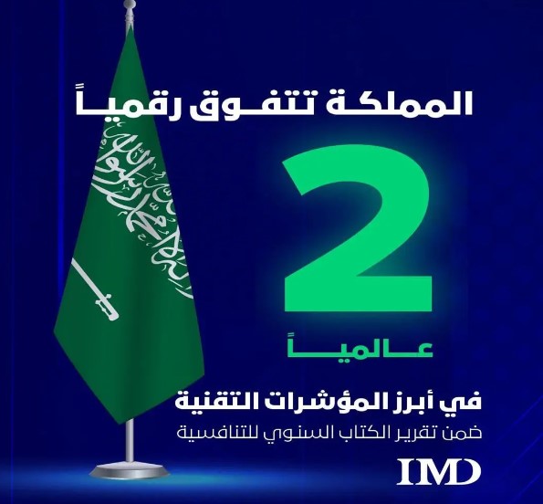 تفوقت المملكة العربية السعودية رقمياً بتحقيقها المرتبة الثانية عالمياً في أبرز المؤشرات التقنية، وذلك حسب تقرير الكتاب السنوي للتنافسية العالمية، الصادر عن مركز التنافسية العالمي التابع للمعهد الدولي للتنمية الإدارية (IMD).