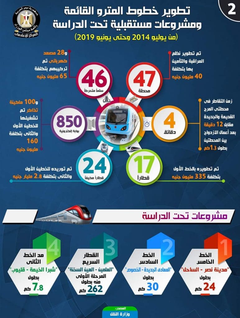 وفيما يتعلق بتطوير خطوط المترو القائمة، خلال الفترة من يوليو 2014 وحتى يونيو 2019، فقد جاء في الإنفوجراف، أنه تم تطوير 17 قطاراً بالخط الأول بتكلفة 335 مليون جنيه، كما تم توريد 24 قطاراً مكيفاً للخطين الأول والثاني بتكلفة 2,8 مليار جنيه، فضلاً عن تشغيل 850 بوابة إلكترونية و100 ماكينة تذاكر للخطين الأول والثاني بتكلفة 160 مليون جنيه، وكذلك تطوير نظم المراقبة والتأمين لـ 47 محطة بتكلفة 40 مليون جنيه، بجانب تركيب 46 سلماً متحركاً و28 مصعداً كهربائياً بتكلفة 65 مليون جنيه، بالإضافة إلى تنفيذ أعمال الازدواج بين محطتي “المرج القديمة والجديدة” بطول 1,3 كم، الأمر الذي ساهم في تقليل زمن التقاطر بين المحطتين إلى 4 دقائق، مقابل 12 دقيقة.