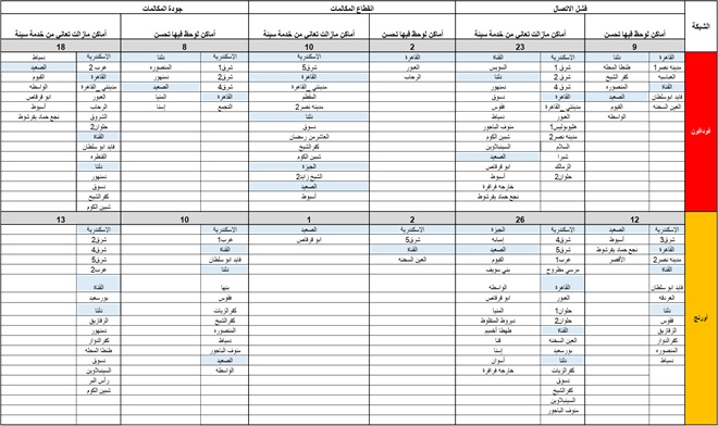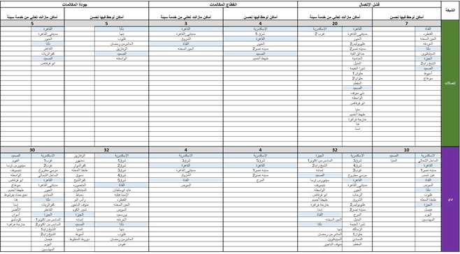 • يوضح الجدول المرفق المدن والأحياء التي لا تزال تعاني من مشاكل معايير جودة الخدمات الصوتية وكذلك المناطق التي ظهر فيها تحسن ويوضح الجدول ما يلي: