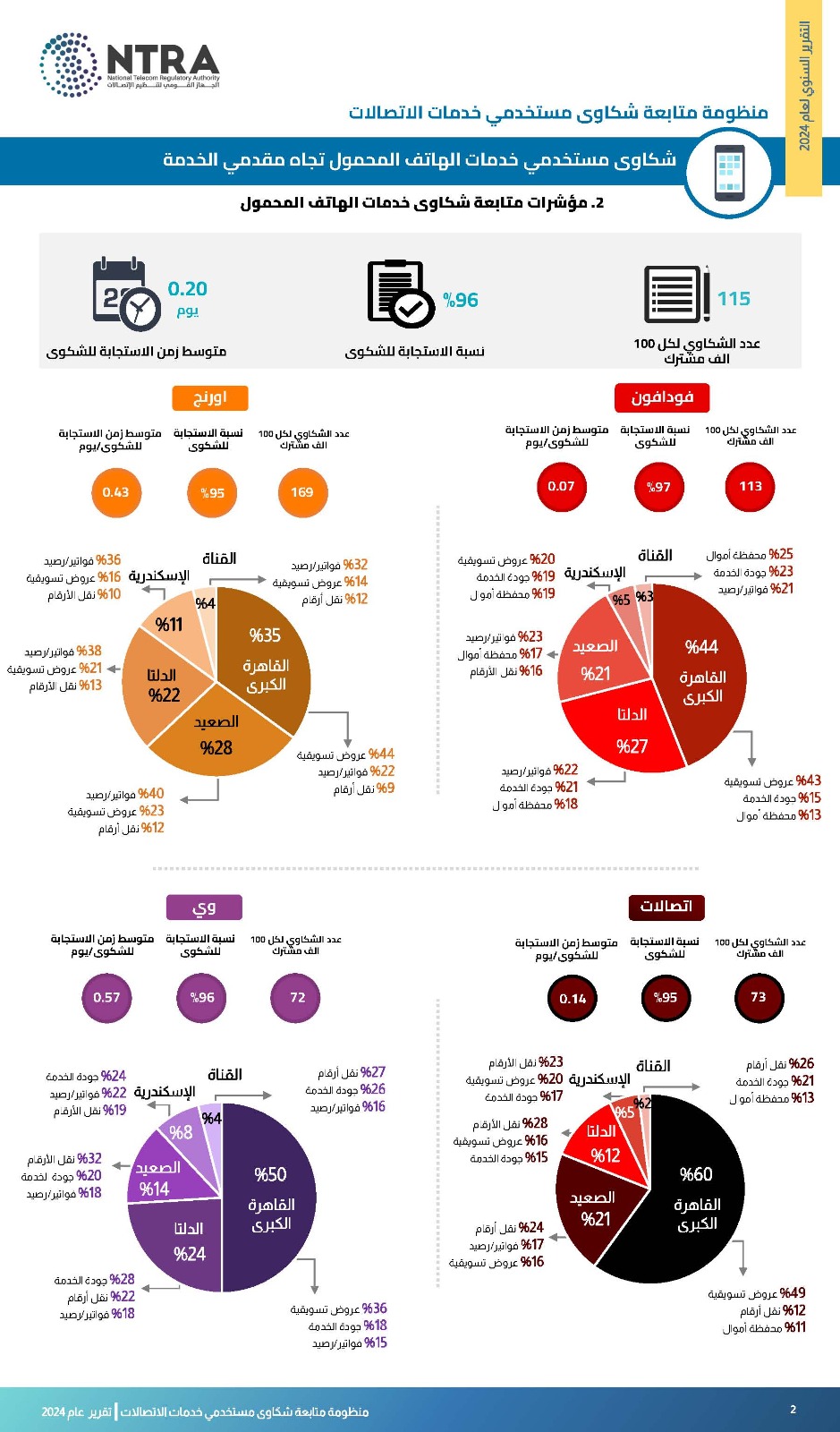 – الدلتا: 28% نسبة الشكاوى من جودة الخدمة، و22% من خدمة نقل الأرقام، و18% من الفواتير/ الرصيد.