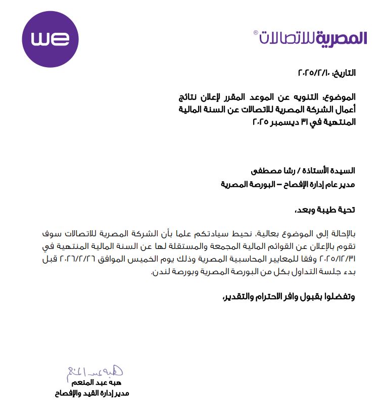 أعلنت الشركة المصرية للاتصالات عن الموعد المقرر للإفصاح عن القوائم المالية المجمعة والمستقلة عن السنة المالية المنتهية في 31 ديسمبر 2025، وذلك وفقًا لمعايير المحاسبة المصرية.