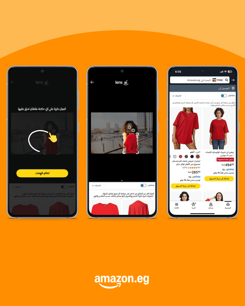 تتيح ميزة البحث بالكاميرا للعملاء التقاط صورة أثناء تواجدهم خارج المنزل أو أثناء مشاهدة التلفزيون أو قراءة مجلة، لتقوم Amazon Lens بالعثور على منتجات مطابقة أو مماثلة ومتاحة للشراء على أمازون مصر.
