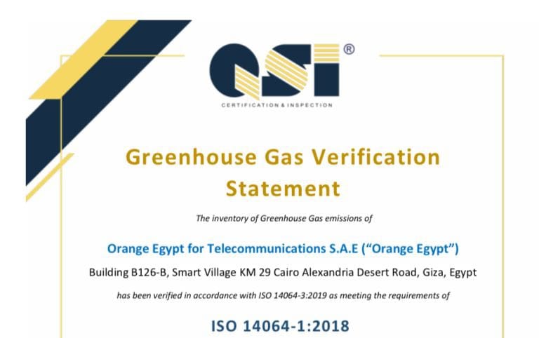 نجحت اورنچ مصر أول مشغل اتصالات في مصر فيةالحصول على شهادة المطابقة الفنية لمعيار «الأيزو» ISO 14064-1: 2018 للتحقق من البصمة الكربونية، لتواصل بذلك حصد الوثائق الدولية المرموقة تقديرا لنجاح جهودها في محاصرة الانبعاثات الكربونية وتنفيذ أنشطتها وتقديم خدماتها المختلفة مع أقصى درجات مراعاة البيئة وحماية المناخ من الغازات الدفيئة، حيث تعد هذه هي شهادة الأيزو الرابعة التي تحصل عليها اورنچ مصر في مجالات ترشيد استخدام الطاقة والتحول نحو المصادر النظيفة واستخدام التقنيات الصديقة للبيئة في جميع عملياتها.