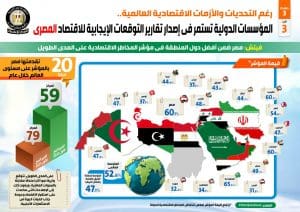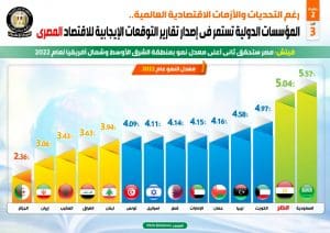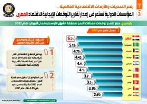 وفي هذا الصدد نشر المركز الإعلامي لمجلس الوزراء تقريراً تضمن إنفوجرافات تسلط الضوء على استمرار التوقعات الإيجابية للمؤسسات الدولية بشأن الاقتصاد المصري، وذلك رغم استمرار التحديات والأزمات الاقتصادية العالمية.