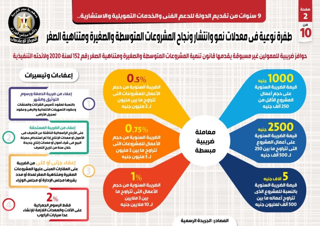 ورصد التقرير الحوافز الضريبية غير المسبوقة للممولين التي يقدمها قانون تنمية المشروعات المتوسطة والصغيرة ومتناهية الصغر رقم 152 لسنة 2020 ولائحته التنفيذية، حيث أقر القانون معاملة ضريبية مبسطة، لتصل قيمة الضريبة السنوية إلى 1000 جنيه على حجم أعمال المشروع الأقل من 250 ألف جنيه، و2500 جنيه على أعمال المشروع التي تتراوح ما بين 250 لـ 500 ألف جنيه، و5 آلاف جنيه بالنسبة للمشروع الذي تتراوح أعماله ما بين 500 ألف لمليون جنيه.