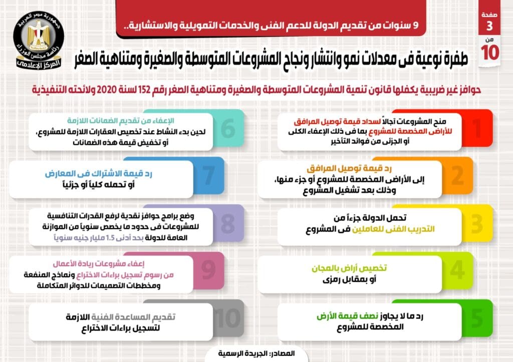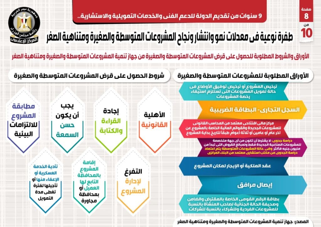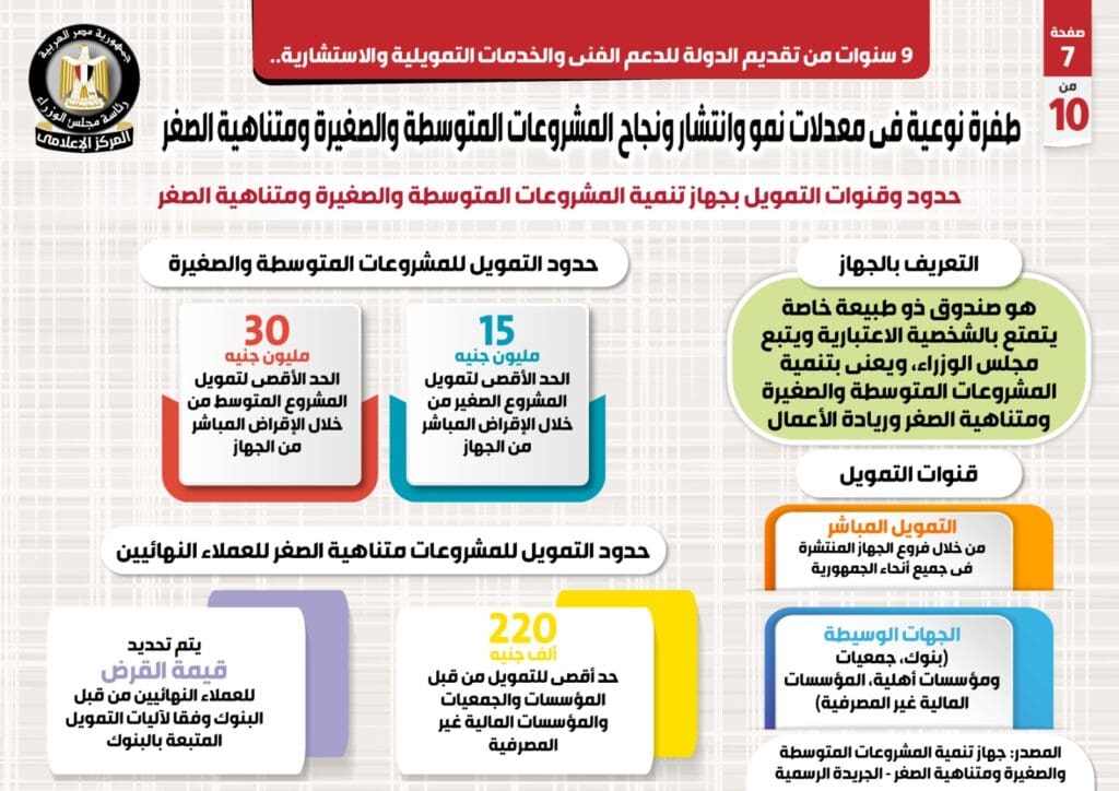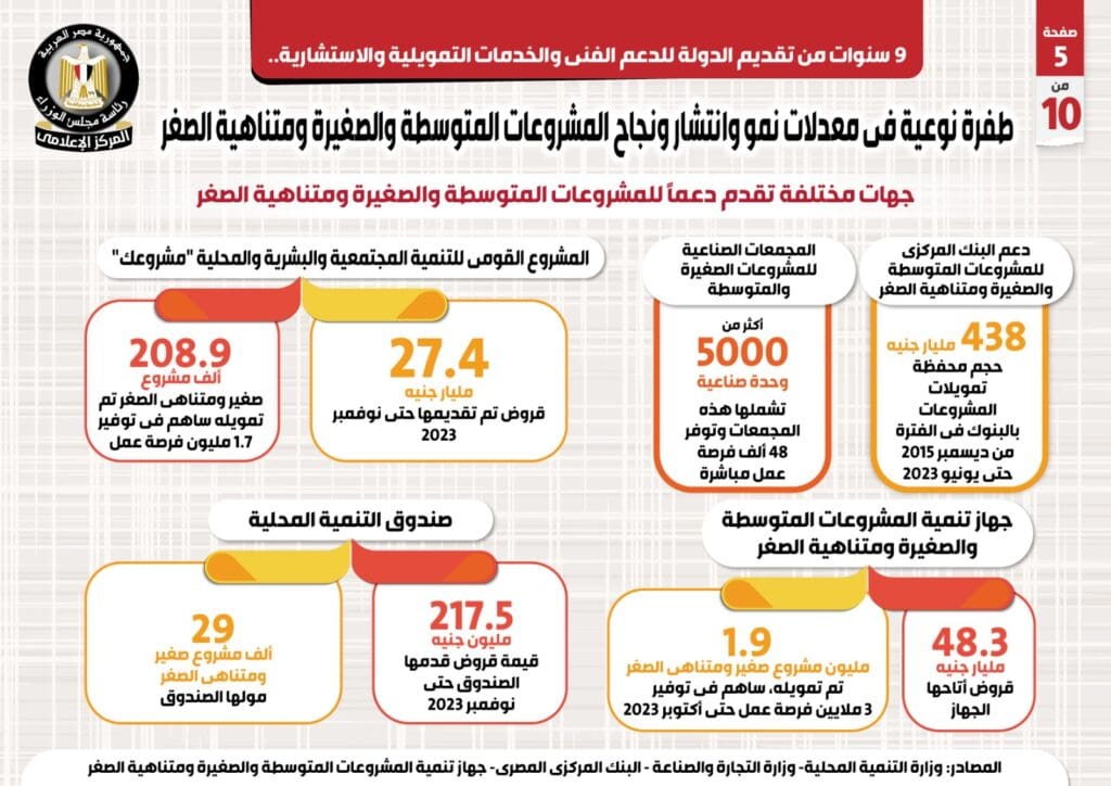 وفي هذا الصدد نشر المركز الإعلامي لمجلس الوزراء تقريراً تضمن إنفوجرافات تسلط الضوء على الطفرة النوعية في معدلات نمو وانتشار ونجاح المشروعات المتوسطة والصغيرة ومتناهية الصغر على مدار 9 سنوات من تقديم الدولة للدعم الفني والخدمات التمويلية والاستشارية.