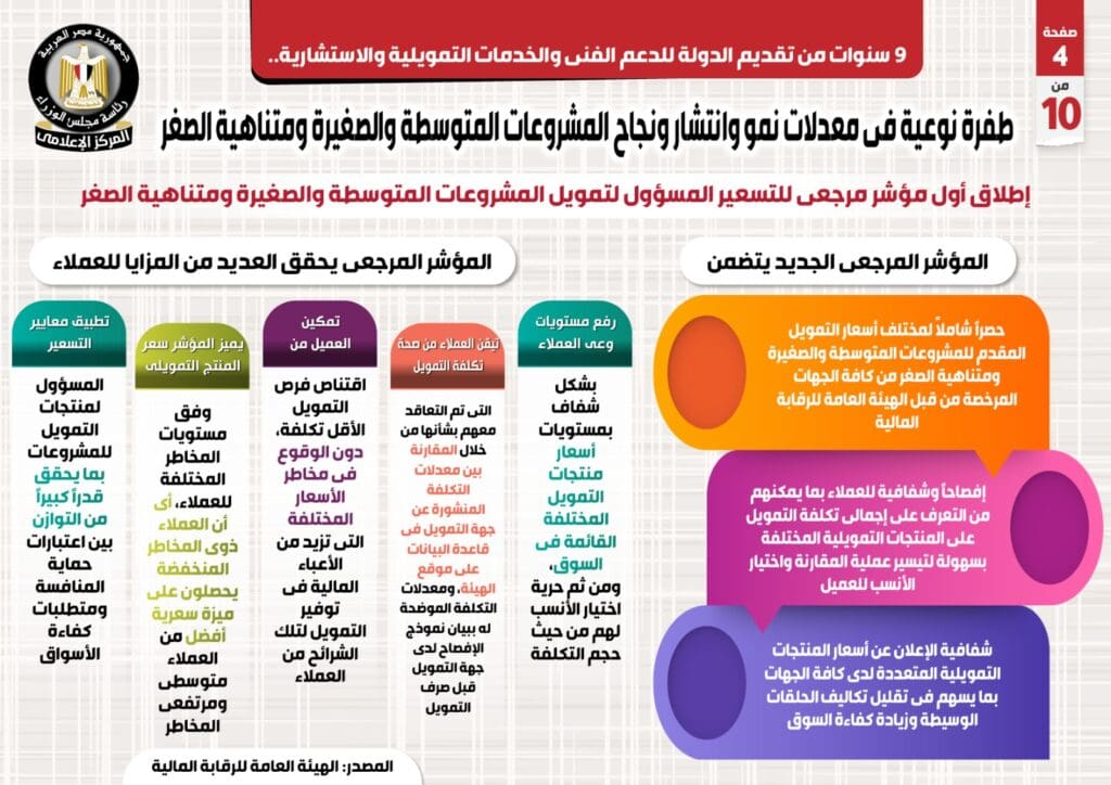 وتناول التقرير الحديث عن إطلاق أول مؤشر مرجعي للتسعير المسؤول لتمويل المشروعات المتوسطة والصغيرة ومتناهية الصغر، حيث يتضمن المؤشر المرجعي الجديد، حصراً شاملاً لمختلف أسعار التمويل المقدم للمشروعات المتوسطة والصغيرة ومتناهية الصغر من كافة الجهات المرخصة من قبل الهيئة العامة للرقابة المالية، وإفصاحاً وشفافية للعملاء بما يمكنهم من التعرف على إجمالي تكلفة التمويل على المنتجات التمويلية المختلفة بسهولة لتيسير عملية المقارنة واختيار الأنسب للعميل.