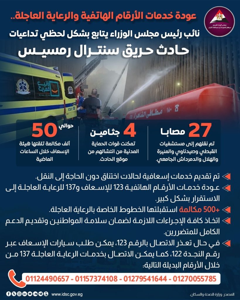 أعلنت وزارة الصحة والسكان عن استعادة الاستقرار الكامل لخدمات الأرقام الهاتفية الخاصة بالإسعاف (123) والرعاية العاجلة (137)، وذلك عقب السيطرة على تداعيات حادث الحريق الكبير الذي نشب بمبنى سنترال رمسيس يوم الإثنين الماضي.