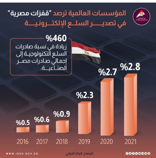 نشر مركز المعلومات ودعم اتخاذ القرار بمجلس الوزراء، على منصاته المختلفة بمواقع التواصل الاجتماعى، سلسلة من الإنفوجرافات حول الخطوات المصرية لدعم الصناعات الإلكترونية بالبلاد، وذلك بهدف تعميق التصنيع المحلى، وتقليل الاستيراد وزيادة التصدير، وفرص العمل.