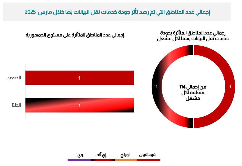 أما إي آند مصر فقد نجحت في تحسين أوضاعها في الربع الأول، حيث انخفضت المناطق المتأثرة من 4 إلى منطقة واحدة فقط في مارس، مع ارتفاع السرعة إلى 60 ميجابت/ثانية. لكن خلال الربع الثاني ارتفع عدد المناطق المتأثرة مرة أخرى ليصل إلى 4 مناطق، مع تراجع السرعة إلى 58 ميجابت/ثانية.