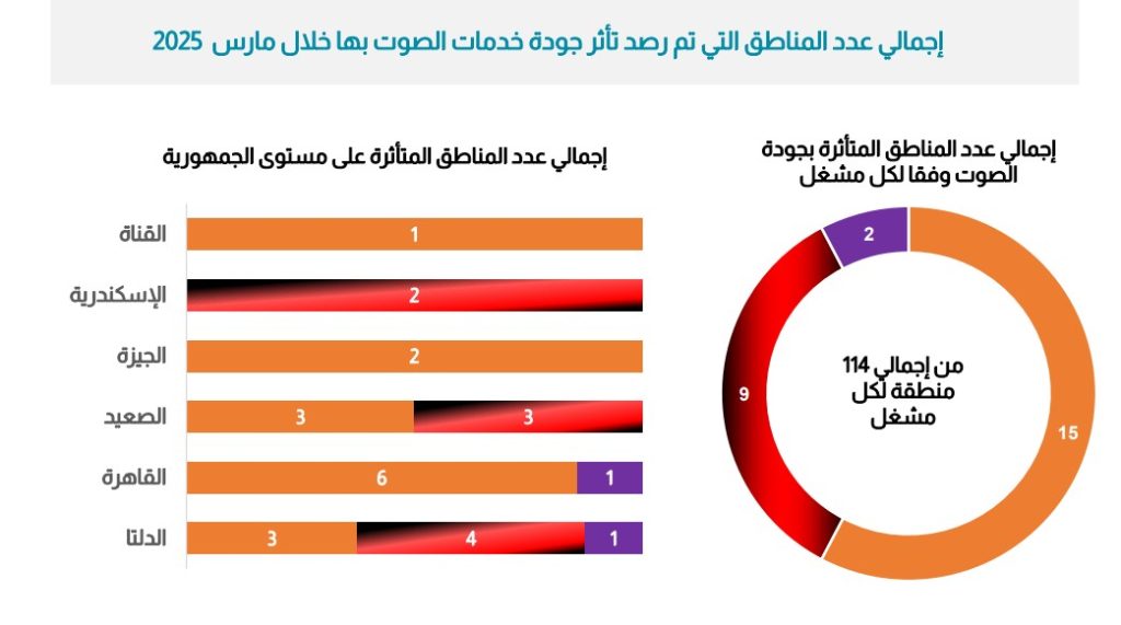 فقد تمكنت فودافون من تحقيق أداء متميز خلال الربع الأول من العام، إذ لم تُسجَّل أي مناطق تعاني من ضعف جودة الصوت في مارس، مقارنة بأربع مناطق في يناير. لكن هذا التفوق لم يستمر طويلًا، حيث تراجع الأداء في الربع الثاني لتصل المناطق المتأثرة إلى 11 منطقة في يونيو.