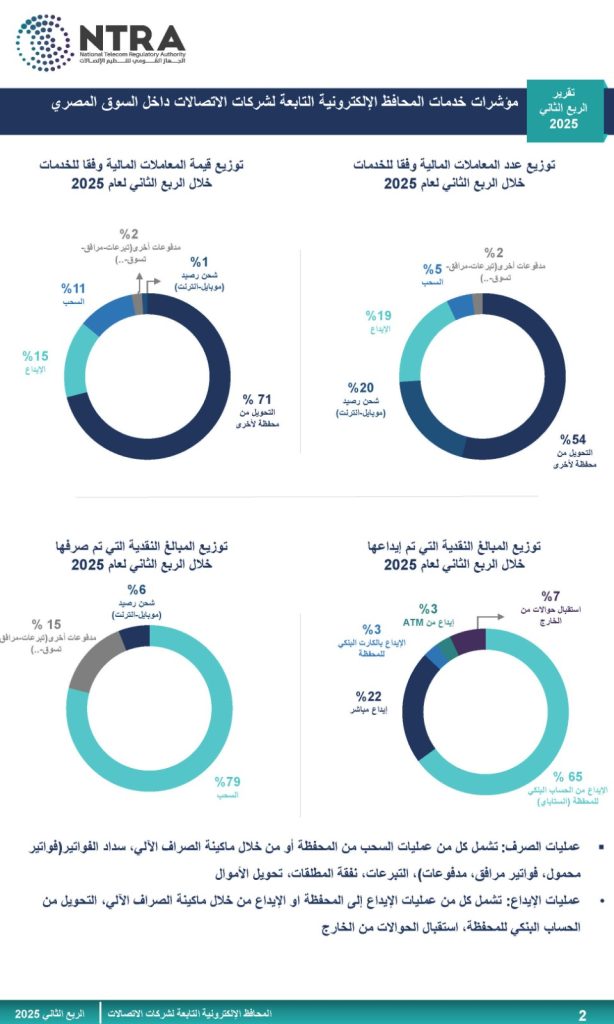 وقد جاءت مؤشرات خدمات المحافظ الإلكترونية التابعة لشركات الاتصالات خلال الربع الثاني لعام 2025 كالتالي: