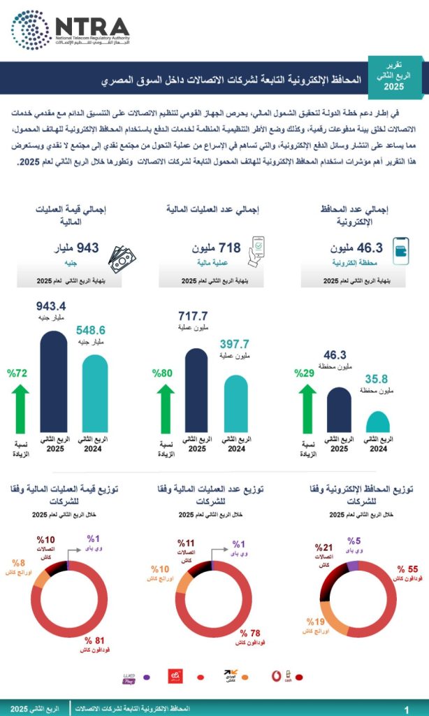 أصدر الجهاز القومي لتنظيم الاتصالات تقرير الربع الثاني لعام 2025 (الفترة من أبريل إلى يونيو 2025) الخاص بمؤشرات استخدام المحافظ الإلكترونية التابعة لشركات الاتصالات، حيث بلغ إجمالي عدد المحافظ الإلكترونية 46.3 مليون محفظة على مستوى الجمهورية، كما بلغ عدد العمليات المالية المنفذة 718 مليون عملية بقيمة إجمالية تبلغ 943 مليار جنيه.