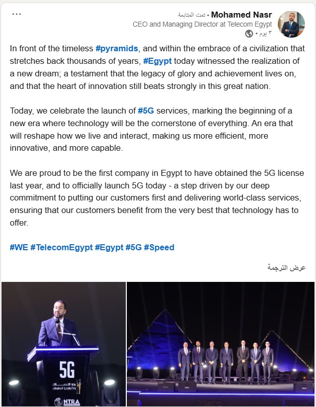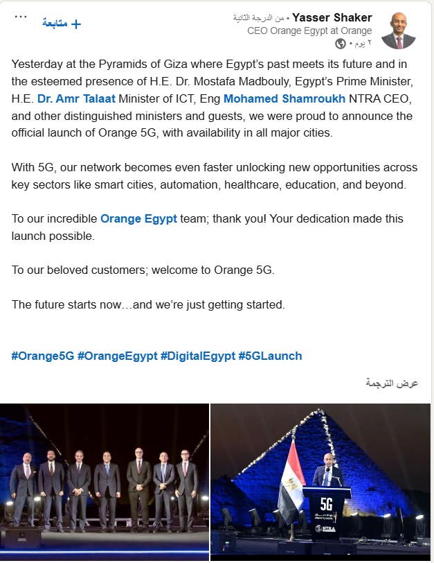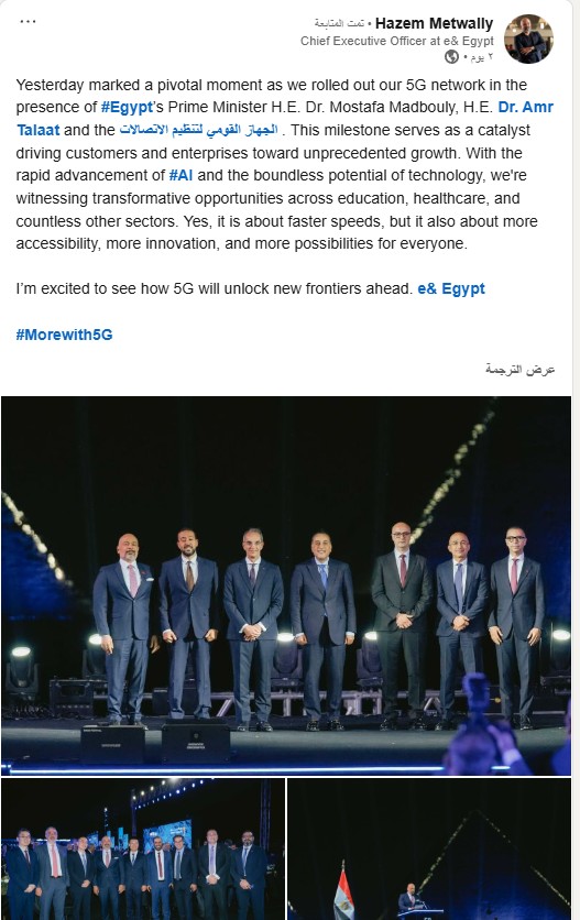 استخدم كل من محمد عبد الله (رئيس فودافون مصر)، و ياسر شاكر (العضو المنتدب لأورنج مصر)، ومحمد نصر (العضو المنتدب للمصرية للاتصالات – وي)، وحازم متولي (الرئيس التنفيذي لـ”إي أند مصر”)، صفحاتهم الرسمية على “لينكد إن” لمشاركة لحظات الفخر والتقدير لهذا الإنجاز الوطني، حيث أكدوا جميعًا على أن إطلاق الجيل الخامس في مصر يمثل “نقطة تحول رئيسية” في قطاع الاتصالات، و”بداية لعصر جديد من الابتكار والتحول الرقمي”، على حد تعبيرهم.