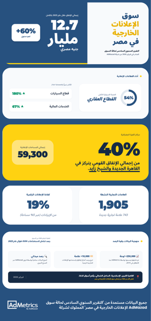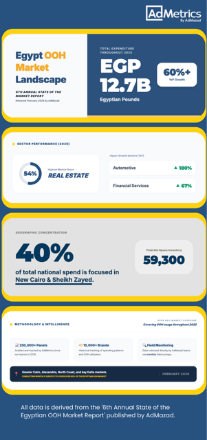 ● الاعتماد على العقارات: حقق القطاع نمواً بنسبة 72% في الإنفاق، لكنه يستحوذ على 81% من المساحات الإعلانية في المدن العمرانية الجديدة مثل القاهرة الجديدة والشيخ زايد.