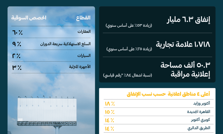 أصدرت شركة AdMazad، الشركة المتخصصة في تطوير AdMetrics، أداة قياس وتحليل أداء إعلانات الطرق في مصر، تقريرها السنوي الخامس عن السوق. ويكشف التقرير عن نمو كبير بنسبة 53% في سوق إعلانات الطرق المصرية خلال عام 2024، حيث بلغ الإنفاق 6.3 مليارات جنيه مصري، مقابل 4.2 مليار جنيه مصري في عام 2023. وتستند هذه النتائج إلى عمليات تدقيق شاملة لأكثر من 50 ألف لوحة إعلانية في القاهرة الكبرى، والإسكندرية، والدقهلية، والغربية، والساحل الشمالي.
