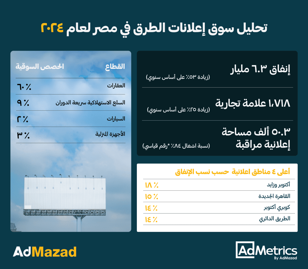 أصدرت شركة AdMazad، الشركة المتخصصة في تطوير AdMetrics، أداة قياس وتحليل أداء إعلانات الطرق في مصر، تقريرها السنوي الخامس عن السوق. ويكشف التقرير عن نمو كبير بنسبة 53% في سوق إعلانات الطرق المصرية خلال عام 2024، حيث بلغ الإنفاق 6.3 مليارات جنيه مصري، مقابل 4.2 مليار جنيه مصري في عام 2023. وتستند هذه النتائج إلى عمليات تدقيق شاملة لأكثر من 50 ألف لوحة إعلانية في القاهرة الكبرى، والإسكندرية، والدقهلية، والغربية، والساحل الشمالي.