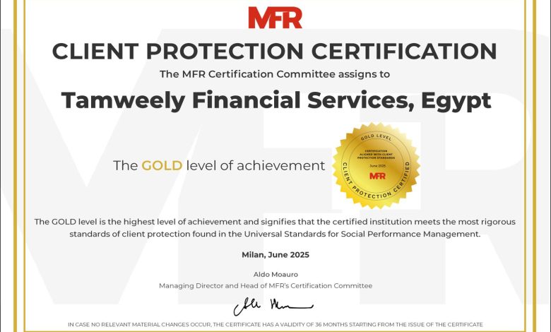 واصلت شركة “تمويلي” رحلة حصولها على شهادات دولية مؤكدة على تفوقها المهني والتزامها بتطبيق أفضل الممارسات والمعايير الدولية في مجال الخدمات المالية غير المصرفية. حيث حصلت الشركة مؤخراً على شهادة حماية العملاء – المستوى الذهبي Gold level – بتقييم من مؤسسة Microfinanza Rating MFR الإيطالية المتخصصة في التقييم المؤسسي لجهات التمويل وبالتعاون الفني من مؤسسة التمويل الدولية IFC وذلك تحت الإشراف المباشر لهيئة الرقابة المالية FRA في مصر.