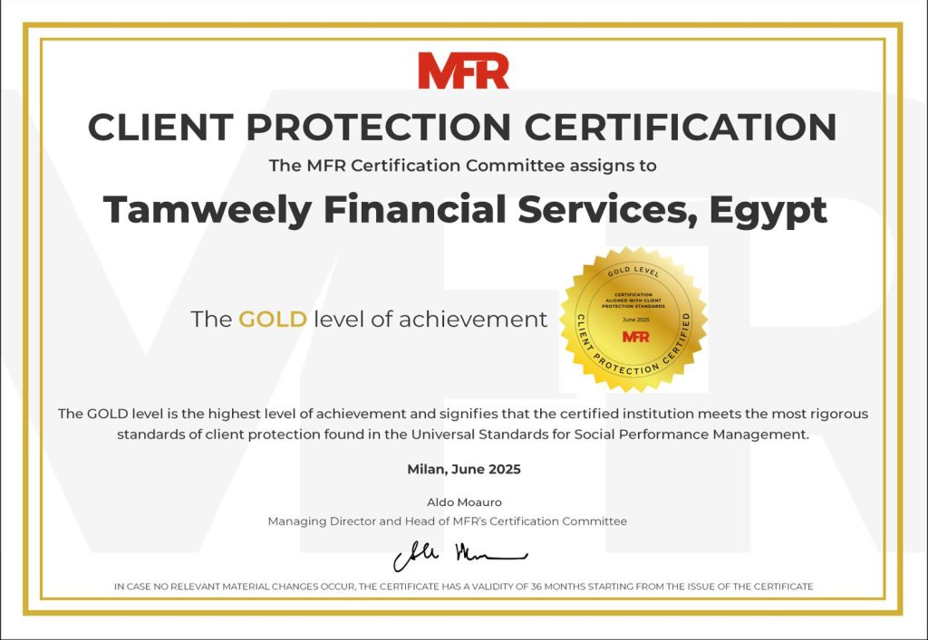 واصلت شركة “تمويلي” رحلة حصولها على شهادات دولية مؤكدة على تفوقها المهني والتزامها بتطبيق أفضل الممارسات والمعايير الدولية في مجال الخدمات المالية غير المصرفية. حيث حصلت الشركة مؤخراً على شهادة حماية العملاء – المستوى الذهبي Gold level – بتقييم من مؤسسة Microfinanza Rating MFR الإيطالية المتخصصة في التقييم المؤسسي لجهات التمويل وبالتعاون الفني من مؤسسة التمويل الدولية IFC وذلك تحت الإشراف المباشر لهيئة الرقابة المالية FRA في مصر.