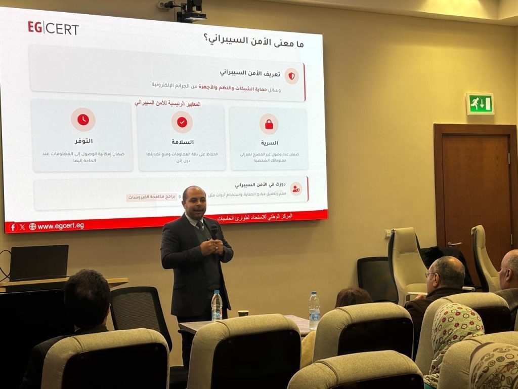 في إطار جهوده المستمرة لنشر الثقافة السيبرانية وتعزيز حماية البيانات الرقمية، شاركت الإدارة التنفيذية لنشر ثقافة الأمن السيبراني بقطاع تنمية صناعة الأمن السيبراني في الجهاز القومي لتنظيم الاتصالات في تنظيم وتنفيذ سلسلة من الندوات التوعوية الموسعة الهادفة إلى رفع مستوى الوعي بالأمن الرقمي داخل الجهاز الإداري للدولة.
