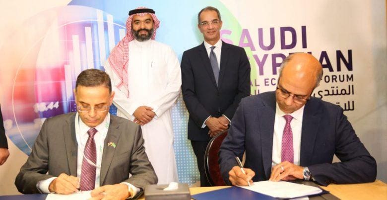 وشهد الوزيران توقيع مذكرة تفاهم بين شركة “ثقة” السعودية العاملة في مجال الحلول الذكية وخدمات الأعمال وخدمات البيانات، وشركة “IPG” المصرية لخدمات الاتصالات وذلك للتعاون في تطوير حلول اعمال ذكية للقطاع الحكومي والخاص في مجالات عدة تخدم الاقتصاد الرقمي المصري؛ كما شهد الوزيران توقيع مذكرة تفاهم بين شركة “بعد” للاتصالات السلكية واللاسلكية السعودية المتخصصة في تنفيذ مشاريع البنية التحتية لتركيب وتشغيل وصيانة أجهزة الاتصالات السلكية واللاسلكية وشبكات تراسل البيانات وأنظمة مراكز المعلومات والاتصالات والبيانات وأمنها، وشركة “مصر للمقاصة والايداع والقيد المركزي” في مجال اعتماد التوقيعات الالكترونية الصادرة من البلدين.