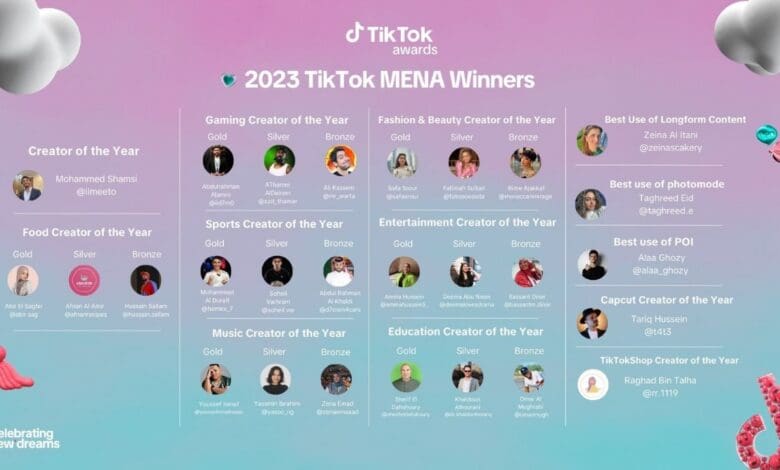 وزّعت منصّة “تيك توك” 26 جائزة احتفالاً بالنجاح الباهر الذي حقّقه صُنّاع المحتوى على المنصّة. وحصل محمد شامسي (@iimeeto)على اللقب المرموق “أفضل صانع محتوى على منصّة ’تيك توك‘ لعام 2023”. وفازت محبوبة الجماهير أمينة حسين بالجائزة الذهبية عن فئة “أفضل صانع محتوى ترفيهي للعام”، بينما فاز مُعلّق رياضة كرة القدم المفضّل على منصّة “تيك توك” محمد الظرافي بالجائزة الذهبية عن فئة “أفضل صانع محتوى رياضي للعام”. لقد كان الفائزون في كل فئة بمثابة شهادة على الإبداع المذهل والتأثير الذي تحتضنه منصّة “تيك توك”.