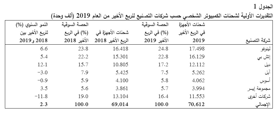 شحنات الكمبيوتر الشخصي تصل إلى 261,2 مليون جهاز في العام 2019، بزيادة بلغت 0.6% مقارنة بالعام 2018 وهذه المرة الأولى التي تشهد فيها أسواق الكمبيوتر الشخصي العالمية نموا منذ سبع سنوات.