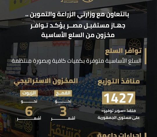 وأشار إلى أن توافر السلع الأساسية يتم بكميات كافية وبصورة منتظمة عبر شبكة منافذ الجهاز «سوبر توفير»، والتي يبلغ عددها 1427 منفذًا، مع وجود مخزون استراتيجي آمن، حيث يصل المخزون الاستراتيجي من القمح إلى نحو 3 أشهر، بينما يغطي مخزون الزيوت نحو 6 أشهر، بما يسهم في تعزيز قدرة الدولة على ضبط الأسواق وتوفير السلع للمواطنين بأسعار مناسبة.