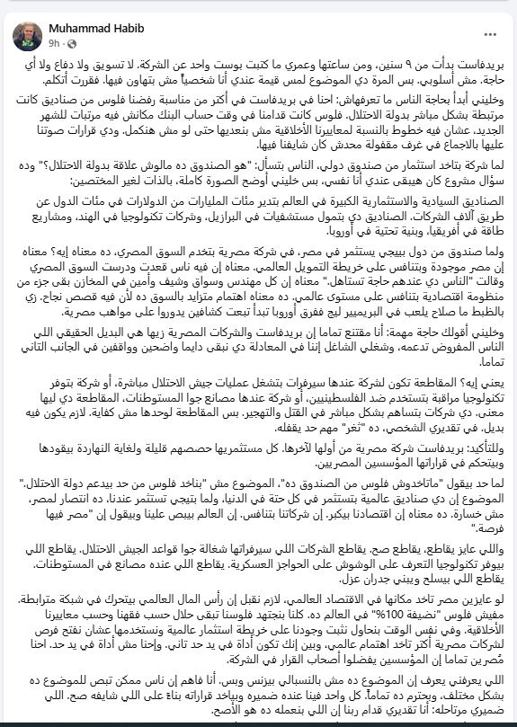 وأكد حبيب في بيان توضيحي على منصة التواصل الاجتماعي الفيس بوك أن هذه الادعاءات غير دقيقة، مشددًا على أن الشركة لم تتلقَّ استثمارات من جهات مرتبطة بشكل مباشر بدولة الاحتلال، موضحًا أن ما أثير يعود إلى استثمار أحد الصناديق العالمية التي تدير رؤوس أموال من جنسيات متعددة، وقد يكون من بين المستثمرين الرئيسيين في هذا الصندوق أفراد من جنسيات مختلفة، من بينها جنسية يهودية، وهو ما لا يعني وجود استثمار إسرائيلي مباشر في الشركة.