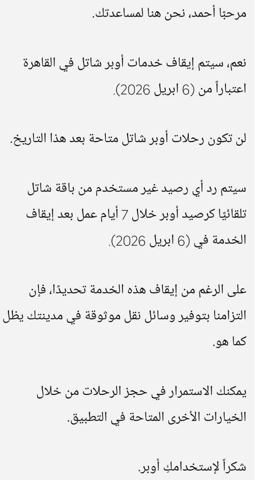 أعلنت شركة Uber عن إيقاف خدمة “أوبر شاتل” في مصر وعدد من الأسواق الأخرى، وذلك اعتبارًا من اليوم 6 أبريل 2026، في إطار مراجعة دورية لأعمالها وإعادة هيكلة بعض الخدمات.