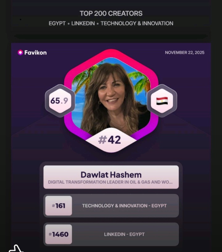 أعلنت منصّة Favikon عن اختيار دولت هاشم، خبيرة التحول الرقمي، ضمن قائمة أفضل 200 منشئ محتوى في مجال التكنولوجيا والابتكار على مستوى منصة LinkedIn في مصر، حيث جاءت في المرتبة 42 ضمن أفضل 50 منشئ محتوى.
