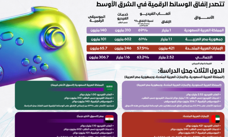 وبيّنت الدراسة أن إجمالي الإنفاق على ألعاب الفيديو في الأسواق الثلاثة الرئيسة محل التحليل، المملكة العربية السعودية، والإمارات العربية المتحدة، وجمهورية مصر العربية؛ بلغ نحو 2.52 مليار دولار خلال عام 2024، مقارنة بـ 1.16 مليار دولار لخدمات الفيديو حسب الطلب، و306.7 مليون دولار للموسيقى. وبذلك تستحوذ الألعاب على 63.2% من إجمالي إنفاق المستهلكين على الوسائط الرقمية في هذه الأسواق.