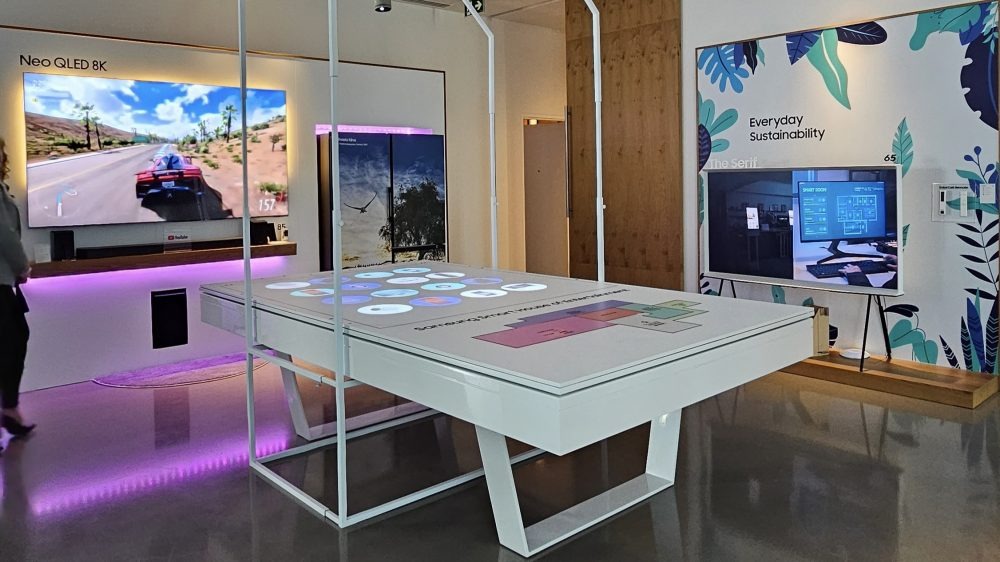 فقد قدمت سامسونج بياناً عملياً خلال الفعالية أوضحت من خلال 5 غرف، كيف يقوم تطبيق SmartThings بتمكّين المستخدمين من إدارة منازلهم بالكامل، حيث يمثل تلفزيون 2023 Neo QLED الجهاز المركزي في المنزل الذي يدار بالكامل من خلاله. وضمت الغرفة العديد من الأجهزة المنزلية التي تعمل بتطبيق SmartThings، بما في ذلك جهاز الصوت Soundbar Q Series، والثلاجة المصممة حسب الطلب، وجهاز تنقية الهواء من سامسونج، والمكنسة الكهربائية الأوتوماتيكية Bespoke Jetbot، وجهاز العرض Freestyle وكاميرا Amazon Ring لأمن المنزل، ويمكن مراقبة جميع هذه الأجهزة عبر تطبيق Smart TV أو تطبيق.SmartThings