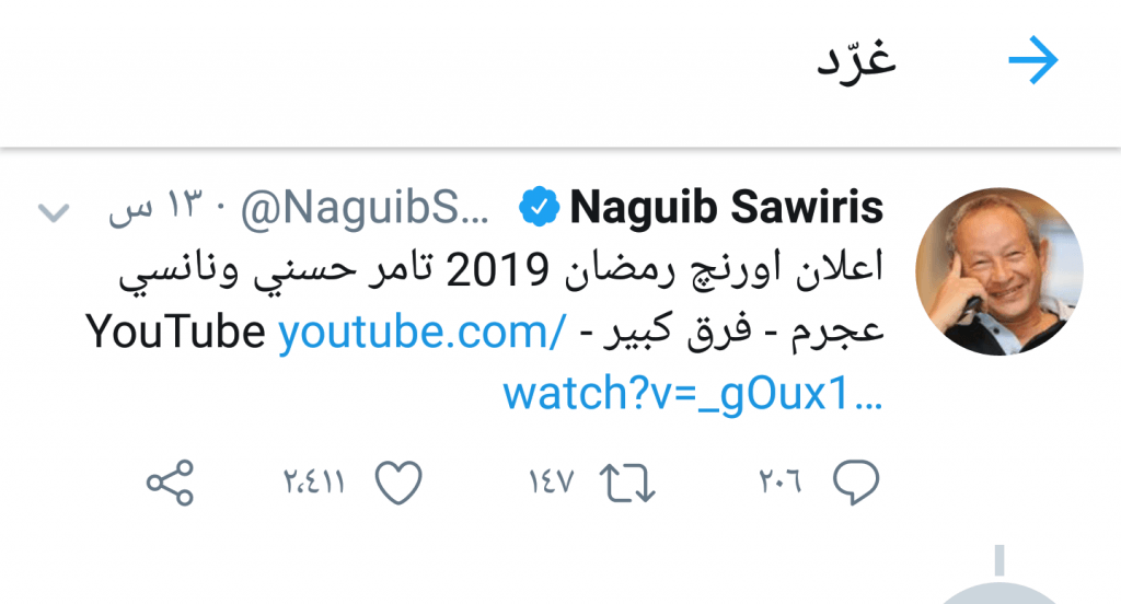غرد المهندس نجيب ساويرس، رئيس شركة اوراسكوم للتكنولوجيا والإعلام عبر حسابه الشخصي على تويتر مشيدا بإعلان اورنج الجديد “فرق كبير” والذي يضم كل من الفنانة نانسي عجرم والفنان تامر حسني .