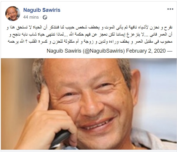 بكلمات رقيقة نعى المهندس نجيب ساويرس رجل الاعمال تلميذه النجيب المرحوم خالد بشاره الذي وافته المنية فجر الجمعة الماضية في حادث سير اليم ، وقال ساويرس في رثاء بشارة على حسابه الشخصي على مواقع التواصل الاجتماعي :