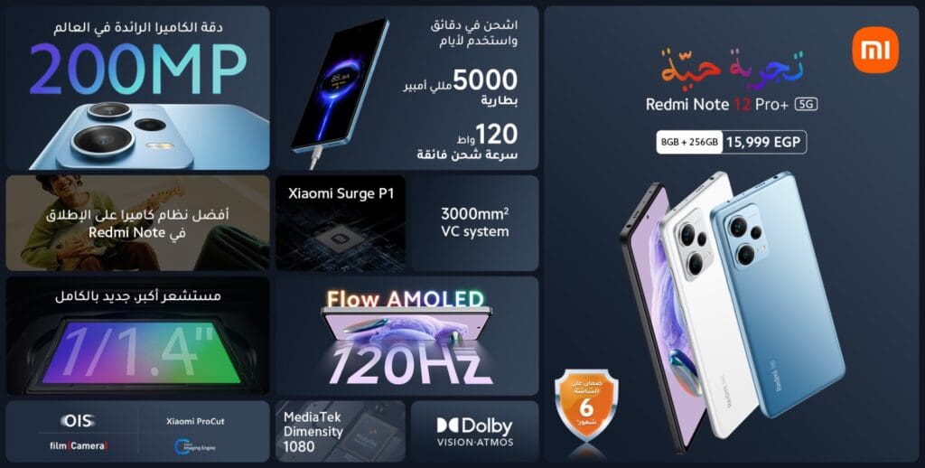 ويدعم كلا الجهازين الشحن السريع ببطارية 5000مللي أمبير في الساعة بقدرة 120 واط لـ Redmi Note 12 Pro + 5G و67 واط لـ Redmi Note 12 Pro 5Gوذلك للاستخدام اليومي الممتد حتى في ظل استهلاك المحتوى الكثيف مما يضمن أداء سلس وموثوق لشبكات الجيل الخامس من خلال مجموعة شرائح MediaTek Dimensity 1080 عالية الأداء. ويأتي سعر Redmi Note 12 Pro + 5G 8+256 (15999) جنيه مصري بينما Redmi Note 12 Pro، Redmi Note 12S يتوفر قريبا.