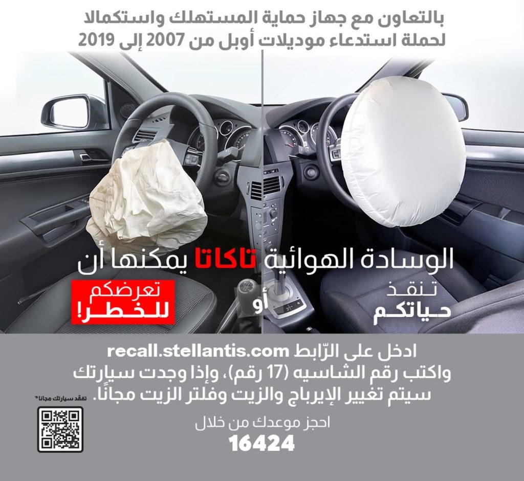 أعلنت شركة المنصور للسيارات وكيل العلامة التجارية اوبل OPEL العالمية ، عن تنفيذ حملة استدعاء لعددٍ من سيارات اوبل ، المُنتجة خلال الفترة من 2007 وحتى إنتاج 2019، وذلك على خلفية رصد عيب تصنيعي في الوسائد الهوائية “تاكاتا” ، بما قد يؤثر على كفاءة أدائها، ويؤدي لحوادث خطيرة، ويأتي هذا الإجراء في إطار التزام الشركة الصارم بمعايير الجودة وسلامة المنتجات المتداولة في السوق، وحرصًا على سلامة مُستخدمي المركبات، وامتثالًا لأحكام قانون حماية المستهلك.